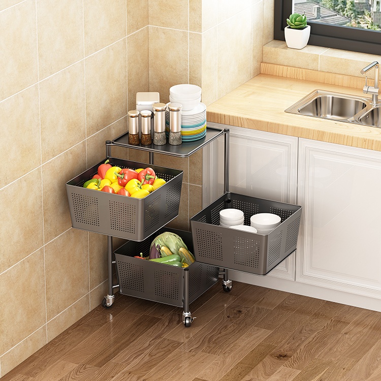 Square Rotating 3 4 5 Tier Stainless Steel Kitchen Storage Rack Fruit Vegetable Storage Basket Utility Trolley Cart with Wheels